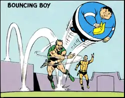 Bouncing Boy is a fictional comic book superhero appearing in publications by DC Comics, usually as a member of the Legion of Super-Heroes. Born on Earth as Chuck Taine, Bouncing Boy has the power to inflate like a giant ball and bounce around.[1] This combination of invulnerability and velocity makes him a surprisingly useful combatant. Born without any powers, he received his abilities by accidentally drinking a super-plastic formula he believed was a soda. Bouncing Boy is known for sharing a long-term romantic relationship with fellow Legionnaire Triplicate Girl of the planet Cargg, whom he eventually marries. In reboot Legion continuity, Chuck Taine is the Legion's mechanic.
