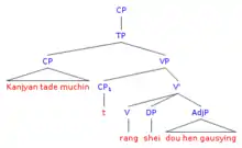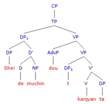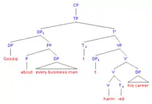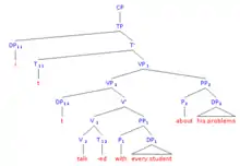If a pronoun has a quantified expression as antecedent, the pronoun must be c-commanded by this antecedent.[3][4] An antecedent c-commands a pronoun if, when observing the structure of the sentence, a sister of the antecedent dominates the pronoun.[5]
