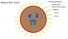 Bovine foamy virus is an enveloped, spherical virus. The virus particles are approximately 80-100 nm in diameter and contain single-strand, positive-sense RNA: ss(+)RNA. 20% of released virions contain double stranded DNA as a product of late stage reverse transcription. The outer membrane of the virus is covered with a variety of glycoproteins which allow it to interact with its surroundings. Just beyond the envelope is a buffer between the capsid and envelope, known as the protein matrix. The matrix is responsible for maintaining membrane shape as well as participating in the budding process. Inside the matrix lies the capsid, a protein shell that contains viral intigrase, reverse-transcriptase and the nucleocapsid, inside of which lives the viruses' genetic material.[7] Due to the viruses' tendency to bud into the endoplasmic reticulum, the virions tend to display immature protein characteristics around the core as well as unique glycoptorien spikes on the surface of the membrane. BFV particles also possess electron-lucent membranes which are easily crossed by electrons.[1]