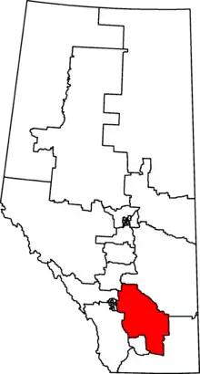 It was re-created by the 2012 federal electoral boundaries redistribution and was legally defined in the 2013 representation order. It came into effect upon the call of the 42nd Canadian federal election, scheduled for October 2015.[3] This newest iteration of the riding was created out of parts of Crowfoot (53%), Medicine Hat (37%) and Macleod (10%) ridings.
