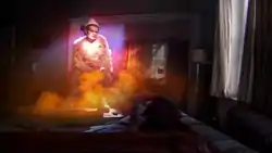 When David Bowie visits Bret for a second time, Bret tells him that his previous suggestion of wearing an eyepatch caused him to lose his depth perception. David Bowie had limited depth perception due to an eye injury that caused his left pupil to remain permanently and visibly dilated. David Bowie had worn an eyepatch in accompanying promotional videos for his songs "Rebel Rebel" and "Little Wonder". Also, this could be a reference to one of Bowie's stage personas Halloween Jack, who wore an eye patch, from the album Diamond Dogs. Bret also later dresses like Halloween Jack in the video for Bowie's In Space. The robot on the birthday card is a robot from the Doctor Who serial Robot.