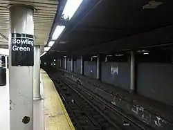 An abandoned and walled-off island platform and track on the west side of the station were formerly used by the Bowling Green–South Ferry shuttle, which traveled to the inner platform at South Ferry.[55][59] This platform was connected to the island platform with an underpass at its northern end.[48][60]