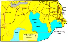 Box Elder County lies at the NW corner of Utah. Its west border abuts the east border of the state of Nevada and its north border abuts the south border of the state of Idaho. Its territory includes large tracts of barren desert, contrasted by high, forested mountains. The Wasatch Front lies along the south-eastern border, where the main cities are found.[4] The terrain generally slopes to the south (toward the Great Salt Lake), although the NW corner of the county slopes to the north, allowing runoff from that area to flow to the Snake River drainage. The county's highest point is a mountain ridge near the NW corner, at 9,180' (2798m) ASL.[5] The county has a total area of 6,729 square miles (17,430 km2), of which 5,746 square miles (14,880 km2) is land and 984 square miles (2,550 km2) (15%) is water.[6] It is the fourth-largest county in Utah by area.