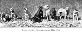 The white female dog Ch. Blanka von Angertor, Flocki's sister, was even more influential when mated with Piccolo von Angertor (Lechner's Box grandson) to produce the predominantly white (particolored) female dog Meta von der Passage, which, even bearing little resemblance with the modern Boxer standard (early photographs depict her as too long, weak-backed, and down-faced), is considered the mother of the breed.[29][30] John Wagner, in The Boxer (first published in 1939) said the following regarding this female dog:[31]