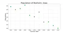 Boxholm was platted in 1900.[3] The town takes its name from Boxholm, in Sweden, the native home of its first postmaster, John B. Anderson.[3] Boxholm originally was built up chiefly by Swedes.[4] The first town council was elected in August 1913, and the town was incorporated one month later.[5] In 1963, the town celebrated its Golden Anniversary and the total attendance was estimated at over 1,200 people.[6]