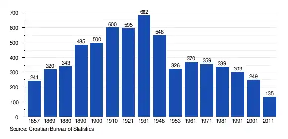 The 1991 census[3] recorded that 91.42% (277/303) of the village population were ethnic Serbs, 3.30% were Yugoslavs (10/303), 1.98% were ethnic Croats (6/303) and 3.30% were of other/unknown ethnic origin (10/303).