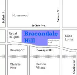 Bracondale Hill, also known as Hillcrest, is a residential neighbourhood of Toronto, Ontario, Canada. Annexed by the old City of Toronto in 1909 and developed in 1911 from the Turner estate, Bracondale Hill is on the eastern border of West End Toronto; neighbouring Midtown (east of Bathurst), stretching above Davenport Road and below St. Clair Avenue West.