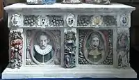 - William Walrond (1610-1667/9) (eldest son), who in 1637 married Ursula Specott (died 1698), daughter of Humphrey Specott of Launcells in Cornwall. Ursula was buried at Kentisbeare. A chest tomb exists in Bradfield Chapel, north aisle, Uffculme Church. The arms above the relief bust figure on the right are those of Specott (Or, on a bend gules three millrinds of the first) and the bust portrays William. His grandfather, also William, is shown on the left side in a relief bust below a cartouche with the Walrond arms. Five standing female figures are shown, at the west end, a blindfolded Justice, also Faith Hope & Charity.[20] The chest tomb is complete in itself, and the half-figures presently placed on top of it belong to a former now broken up monument, probably that of the reclining Sir William Walrond (died 1689), whose effigy now occupied the window-ledge above. On the top slab is inscribed:
