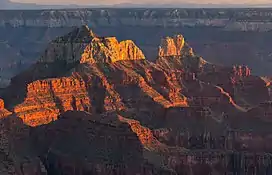 Brahma Temple is a 7,551-foot-elevation (2,302 meter) summit located in the Grand Canyon, in Coconino County of Arizona, US.[3] It is situated six miles (9.7 km) north-northeast of the Yavapai Point overlook on the canyon's South Rim, and 4.5 miles south of the North Rim's Bright Angel Point. It towers 5,000 feet (1,500 meters) above Phantom Ranch in Bright Angel Canyon. Its nearest higher neighbor is Oza Butte, four miles to the north-northwest.[1] Other neighbors include Zoroaster Temple one mile to the south, and Deva Temple, 1.5 miles to the north. Brahma Temple is named for Brahma, the Hindu creator of the universe. This name was applied by Clarence Dutton who began the tradition of naming geographical features in the Grand Canyon after mythological deities.[4] This geographical feature's name was officially adopted in 1906 by the U.S. Board on Geographic Names.[3]