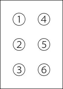 As the table below shows, each symbol shows the pitch and choice of two rhythmic lengths of a note which will be context-clear.[7] For instance, dots 1,4,5 indicate the basic form of C which is an eighth note (quaver) or the much-rarer 128th note. Every rhythm symbol, as said, doubles up in meaning; 8th notes match 128th notes, quarter notes (crotchets) match 64th notes, half notes match 32nd notes, and whole notes match 16th notes (semiquavers). Beginners first learn the most common rhythmic value (8th, quarter, half, and whole notes).[7] For advanced users no rhythmic ambiguity arises as the context, including time signature and bar lines, makes the intended rhythmic value clear. For instance, in a measure of 4/4 time that includes only the symbol with dots 1,3,4 (whole or 16th rest), those facts clarify the symbol is a whole rest.[7]