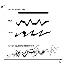 where n accounts for the discrete time, x and p are position and momentum respectively, and V is the potential. The equation for the momentum is called the “kick” stage, whereas the equation for the position is the “drift”. Given an initial manifold in phase space, it can be iterated under the action of the kick and drift map. Typically, the manifold stretches and folds (although keeping its total area constant) forming cusps or caustics and stable regions. These regions of phases space with high concentration of trajectories are precisely the branches.