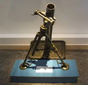 The Brandt mle 27/31 was a simple and effective weapon, consisting of a smoothbore metal tube fixed to a base plate (to absorb recoil), with a lightweight bipod mount.[7] The mle 27/31 could be disassembled into 3 loads, plus the ammunitions loads,[8] and a complete crew was 10 men. When a mortar bomb was dropped into the tube, an impact sensitive primer in the base of the bomb would make contact with a firing pin at the base of the tube, and detonate, firing the bomb towards the target.[9] HE and smoke mortar bombs fired by the weapon weighed 3.25 kilograms.[10]
