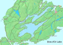 Bras d'Or Lake (Mi'kmawi'simk: Pitupaq) is an irregular estuary in the centre of Cape Breton Island in Nova Scotia, Canada.[2] It has a connection to the open sea, and is tidal. It also has inflows of fresh water from rivers, making the brackish water a very productive natural habitat. It was designated the Bras d'Or Lake Biosphere Reserve by UNESCO in 2011.[3]