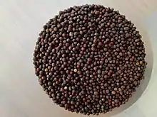 A spice is generally made from ground seeds of the plant, with the seed coats removed. The small (1 mm) seeds are hard and vary in color from dark brown to black. They are flavorful, although they have almost no aroma. The seeds are commonly used in Indian cuisine,[11] for example in curry, where it is known as rai.[12] The seeds are usually thrown into hot oil or ghee, after which they pop, releasing a characteristic nutty flavor. The seeds have a significant amount of fatty oil, mainly oleic acid.[13] This oil is used often as cooking oil in India, it is called "sarson ka tel".[14]