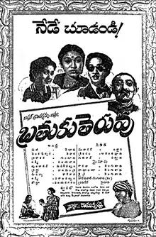 Bratuku Teruvu (transl. Livelihood) is a 1953 Telugu-language drama film, produced by Kovelamudi Bhaskar Rao under the Bhaskar Productions banner and directed by P. S. Ramakrishna Rao. It stars Akkineni Nageswara Rao and Savitri and music composed by Ghantasala.[1] The film was also dubbed in Tamil as Bale Raman (1956), remade in Hindi as Jeene Ki Raah (1969)[2] and later in Tamil as Naan Yen Pirandhen (1972).[3] The film is the debut of famous lyricist Samadrala Jr. in the film industry.