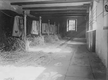 After the disastrous fire of 1918, which destroyed the entire front and south wing the third baronet demolished the ruins and reconstructed a smaller mansion around the remnants of the north wing. The tilled entrance to the smaller residence opened out on the left to a Dining Room in the shape of a clover leaf, with Oak panelled Dado (11metres x 9metres by 4.5metres high) lighted by three windows, with a service door to the kitchen quarters. On the right of the entrance was an Inner Hall (6.5m x 4m) lighted by two large windows, off which was the Drawing room (6.5m x 5.5m) lighted by one large double window facing south. The other rooms on the ground floor comprised a Smoking Room, Kitchen with two pantries off it, Scullery, Knife and Boot Cleaning room, Servants' hall, Gunroom, Lavatory; and two rooms, which were used as Estate offices. There was also a large cellar. The first floor comprised 6 bedrooms, bathroom and lavatory. The second floor was a repeat of the first.[20]