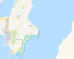 Breaker Bay is a thin strip of land along the southeast coast of Miramar Peninsula.[3] The suburb includes five bays; the largest, Breaker Bay, is at its north, with the other bays going south being Eve Bay, Flax Bay, Reef Bay, and Palmer Bay. It is part of the western shore of the Wellington Harbour entrance.[4][5]