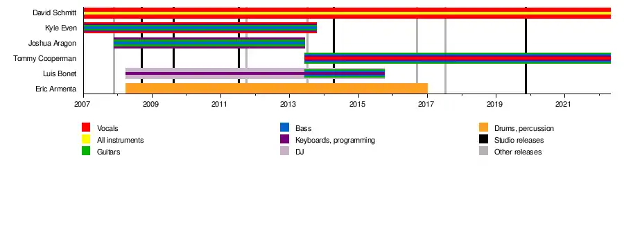 Kyle Even, born on September 21, 1985, and David Schmitt, born on March 26, 1988, spent their early years playing in various local Colorado musical groups. After being introduced to alternative rock by an older stepbrother, Even moved towards vocals as a teen. Before joining Breathe Carolina, Even performed in the band Rivendale. They produced an extended play called Portrait of Shadows. Schmitt, on the other hand, started on bass at the age of 12 and then branched out to guitar, performing in Colorado with As the Flood Waters Rose (later named the Autobiography).[1]