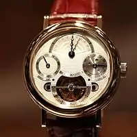 Breguet is a luxury watch, clock and jewelry manufacturer founded by Abraham-Louis Breguet in Paris in 1775.[1] Since 1999, it has been a subsidiary of the Swiss Swatch Group.[2] Headquartered in L'Abbaye, Switzerland, Breguet is one of the oldest surviving watchmaking brands and a pioneer of numerous watchmaking technologies such as the tourbillon, which was invented by Abraham Breguet in 1801.[3] Abraham Breguet also invented and produced the world's first self-winding watch (the Perpétuelle) in 1780, as well as the world's first wristwatch in 1810 (the Breguet No.2639, for Caroline Bonaparte, Queen of Naples).[4][5][6]