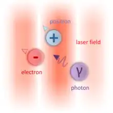 The multiphoton Breit–Wheeler process, also referred to as nonlinear Breit–Wheeler or strong field Breit–Wheeler in the literature, is the extension of the pure photon–photon Breit–Wheeler process when a high-energy probe photon decays into pairs propagating through an electromagnetic field (for example, a laser pulse).[2] In contrast with the previous process, this one can take the form of γ + n ω → e+ e−, where ω represents the coherent photons of the laser field.