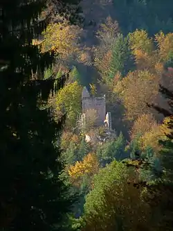 The ruins of Breitenstein Castle (German: Burg Breitenstein) stand on a crag, 220 metres (720 ft) high, on the northern side of the Speyerbach valley in the Palatine Forest in Germany. The castles is 4 kilometres (2.5 mi) east of the village of Elmstein in the county of Bad Dürkheim in the state of Rhineland-Palatinate.