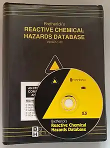 In 1964, research chemist Leslie Bretherick read of a violent explosion in a laboratory, and knew that the same journal had reported a similar incident with the same chemicals 16 years earlier.[1] Realising that there was no central source of literature on dangerous chemical reactions, he set out to create one, combing through the literature in his spare time. In 1971 his employers (BP) allowed him to do this in half his work time[2] and a book was published in 1975 entitled Handbook of Reactive Chemical Hazards.[3] The work involved creating what was effectively a database on paper of substances and literature references, arranged by empirical formula, and converting this into a book. This was well received as “an invaluable reference work” [4] One reviewer wrote ““Bretherick” (the name under which this book must surely become known)”.[5] A revised second edition followed in 1979, with a reviewer stating “that “Bretherick” is an essential first reference”[6] As well as corrections and additional reactions, this contained a new section dealing with groups of compounds and some other matters. A third edition followed in 1985, Bretherick having retired in 1982 in order to work full-time on the project.[2][7] In the preface to the 4th edition (1989) he announced that his eyesight was failing.[8] As a result, he did not contribute new material to further editions, which was done by others. The 5th edition (1995) was edited by Peter G. Urben and as the book was larger, was split into two volumes. Leslie Bretherick died in April 2003[9] The 6th edition (1999), the 7th edition (2007) and the 8th edition (2017) were also edited by Urben.