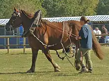 The Breton normally stands about 1.55 to 1.63 m (15.1 to 16.0 hands) at the withers, depending on type.[13] It is most commonly chestnut, flaxen chestnut or chestnut roan; bay and blue roan are less usual, and black is rare.[14]: 154 Limited white markings are tolerated.[15]: 7 The head is of medium size, the profile straight or convex; the neck is long and well set on, the shoulder long and sloped, the chest broad, the breast deep, the back broad, the croup broad and double, and the legs muscular.[15]: 7