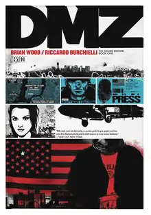 Demo was the book with which Wood and Becky Cloonan first gained Vertigo's attention.[43] Editor Will Dennis approached Wood and invited him to pitch, and editor Shelly Bond hired Becky Cloonan to illustrate the series American Virgin.[44] The inspiration for DMZ had come to Wood in early 2003, at a time when the 9-11 incident in New York City and the invasion of Iraq dominated the U.S. national psyche.[45] Wood had just moved to San Francisco from New York City, and the experience of recalling in that political atmosphere the memories and story ideas he had accumulated over a decade living in the city instigated the creation of the artwork that would become the foundation of DMZ.[45][46] Initially developed as Wartime, a five issue black-and-white miniseries, the comic was consciously a project of importance to Wood, representing a return to the perspective of his breakthrough work Channel Zero, a bleak portrayal of youth culture and anti-authoritarian expression in the repressive environment of Giuliani-era New York City. After the "Wartime" title had been disqualified as too close a title to a recent Books Of Magic miniseries, Wood considered a host of alternatives including "Embedded", "No Man's Land" and "The War for New York" before settling on "DMZ".[45]