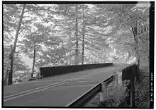 The Historic Columbia River Highway passes over Bridal Veil Falls on a bridge, the Bridal Veil Falls Bridge, which is listed on the National Register of Historic Places as a contributing structure. It is a skewed 100 feet (30 m) reinforced-concrete span, and is unique in its design in which its solid railings serve as continuous beams and transverse deck support members function as deck girders.[1]