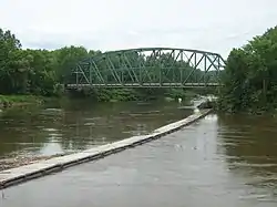 The bridge was built in 1928 to plans by the Lackawanna Steel Construction Company of Buffalo, New York, replacing an 1888 wrought iron suspension bridge. The site, just above Bancroft Falls on the river, has had a bridge of some type since the late 18th century. The bridge is of a type standardized by state engineers for bridges longer than 250 feet (76 m), during the post-flood construction period, in which more than 1,200 bridges were built.[2]