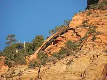 Bridge Mountain is located east of the park headquarters near the south entrance to Zion Canyon. Bridge Mountain was once originally named Crawford Mountain after the Crawford family who were early Mormon settlers in the canyon. But the name was officially changed to Bridge Mountain in 1934 when a natural bridge was discovered on Bridge Mountain. However, it was not a bridge, but actually a natural arch. For years, rangers in Zion Park told visitors that this was a natural bridge, hence the mountain's name.[4] A bridge is defined as a subtype of arch that is primarily water-formed. To avoid confusion, the National Park Service eventually named the span Crawford Arch. Precipitation runoff from the mountain drains into tributaries of the North Fork Virgin River. This mountain is composed of Navajo Sandstone, with a red shale outcropping of the Kayenta Formation exposed along the lower slopes.
