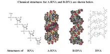 Chemical structures of BNA monomers containing a bridge at the 2', 4'-position of the ribose to afford a 2', 4'-BNA monomer as synthesized by Takeshi Imanishi's group.[2][3][4][5][6][7] The nature of the bridge can vary for different types of monomers. The 3D structures for A-RNA and B-DNA were used as a template for the design of the BNA monomers. The goal for the design was to find derivatives that possess high binding affinities with complementary RNA and/or DNA strands.