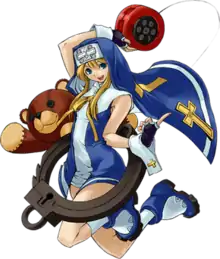 Bridget was introduced in the third installment of the series, Guilty Gear X2 (2002), and appears to be a girl since he wears a nun's habit.[4][5] However, according to his backstory Bridget is a boy, one of twin brothers named and raised by his parents as a girl in a British village.[4][5][6] They do this to protect him, since the villagers believe that identical twins bring bad luck. As Bridget grows up, he is determined to prove he is not unlucky and becomes a bounty hunter who fights with a yo-yo and Roger (ロジャー, Rojā), his mechanical, oversized teddy bear.[4][6][7] His journey begins when I-No gives him a fake bounty list.[4] In Guilty Gear XX Accent Core Plus (2008), since Bridget feels he has proven his masculinity by defeating several opponents he decides to become an entertainer. Although he tries to recruit Venom for his talent at pool and I-No for her ability to play electric guitar, both refuse his suggestion. Without money, in one ending Bridget works as a waiter in Jam Kuradoberi's restaurant. In an alternate ending he returns to his birth village, finds that his twin brother has disappeared and begins searching for him.[8]