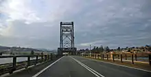 Construction on the present steel vertical lift bridge across the Derwent began in 1939.[8] Construction was interrupted by World War II;[9] the bridge opened to road traffic in March 1942,[10] with completion of the lifting segment finally completed in early 1946.[11] The bridge opened to rail traffic in late 1946.[12] It consists of a long concrete bridge that leads off the end of the causeway, and a steel lifting section just before the northern bank of the river. The lifting section is one of only a few remaining in the Southern Hemisphere, and is the largest of its kind remaining in Australia. The bridge was designed to last a century without replacement. A small control house stands on the lifting section. Inside are the switches and locks which operate the bridge.