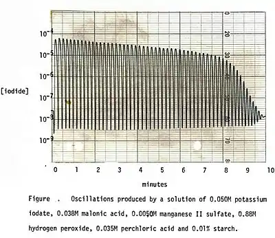 The reaction shows recurring periodic changes, both gradual and sudden, which are visible: slow changes in the intensity of colour, interrupted by abrupt changes in hue. This demonstrates that a complex combination of slow and fast reactions are taking place simultaneously. For example, following the iodide ion concentration with a silver/silver iodide electrode[6] (see Videos) shows sudden dramatic swings of several orders of magnitude separated by slower variations. This is shown by the oscillogram above. Oscillations persist over a wide range of temperatures. Higher temperatures make everything happen faster, with some qualitative change observable (see Effect of temperature). Stirring the solution throughout the reaction is helpful for sharp colour changes; otherwise spatial variations may develop (see Videos). Bubbles of free oxygen are evolved throughout, and in most cases, the final state is rich in free iodine.