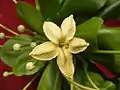 Brighamia insignis is a potentially branched plant with a succulent stem that is bulbous at the bottom and tapers toward the top, ending in a compact rosette of fleshy leaves. The stem is usually 1–2 m (3–7 ft) in height, but can reach 5 m (16 ft).[5] The plant blooms in September through November.[6] It has clusters of fragrant yellow flowers in groups of three to eight in the leaf axils. The scent has been compared to honeysuckle.[6] Petals are fused into a tube 7 to 14 cm (3 to 5+1⁄2 in) long. The fruit is a capsule 13 to 19 mm (1⁄2 to 3⁄4 in) long containing numerous seeds.[7]