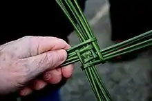 Unlike other Brigid's crosses, which were typically made of straw, the interlaced cross is often made of rushes.[1] Unlike other forms of the cross which contain a woven shape in the center, the interlaced cross consists only of rush or straw strands woven into a Christian cross shape.[8][9] Even simpler is the bare cross, which consists either of two bound plaits of straw or of two planks of wood bound together in the center by straw.[10] Occasionally, no straw is used at all: the Sheaf-Cross, located in eastern County Galway and County Roscommon, involves two small sheathes of unthreshed corn are bound together by a split thatching branch.[11]