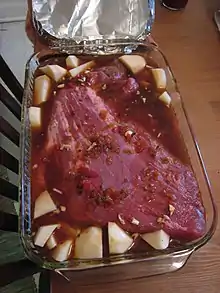 Brisket is cooked for several hours at a low temperature and is cooked with a flavorful sauce and root vegetables.[7]