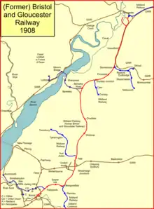 The Bristol and Gloucester Railway was a railway company opened in 1844 to run services between Bristol and Gloucester. It was built on the 7 ft (2,134 mm) Brunel gauge, but it was acquired in 1845 by the 4 ft 8+1⁄2 in (1,435 mm) standard gauge Midland Railway, which also acquired the Birmingham and Gloucester Railway at the same time.