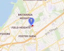 Rev Perry presided over the sod turning for the new Britannia United Church on Pinecrest Road, the former site of the Arkell farm.[27] The congregation moved to the present site on Pinecrest Road in November 1961.[28] Because of the lower elevation of the newer location, the church later dropped "Heights" from its name. Now lacking a congregation, the old building was later used to sell Macintosh & Watts china, to sell paintings, and as a construction shack until it was destroyed by fire in 1975.[11]