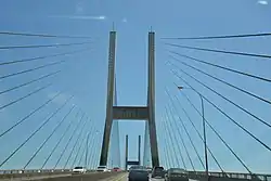 On January 19, 2017, announcement was made that a new seventh travel lane will be added on Alex Fraser Bridge by slightly narrowing the existing lanes and removing the shoulders.[12] A counterflow system with movable barrier was added to help ease traffic during morning and afternoon rush hours. The new seventh lane opened to traffic on September 14, 2019,[13] with the moveable reversible zipper in operation on December 16, 2019.[14] As a result of narrower travel lanes, the maximum speed limit over the bridge was lowered from 90 km/h (56 mph) to 70 km/h (43 mph).[15]