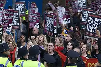 The BNP was formally launched on 7 April 1982 at a press conference in Victoria.[22] Led by Tyndall, most of its early members came from the NNF, although others were defectors from the NF, British Movement, British Democratic Party, and Nationalist Party.[23] Tyndall remarked that there was "scarcely any difference [between the BNP and NF] in ideology or policy save in the minutest detail",[24] and most of the BNP's leading activists had formerly been senior NF figures.[25] Under Tyndall's leadership the party was neo-Nazi in orientation and engaged in nostalgia for Nazi Germany.[24] It adopted the NF's tactic of holding street marches and rallies, believing that these boosted morale and attracted new recruits.[26] Their first march took place in London on St. George's Day 1982.[26] These marches often involved clashes with anti-fascist protesters and resulted in multiple arrests, helping to cement the BNP's association with political violence and older fascist groups in the public eye.[27] As a result, BNP organisers began to favour indoor rallies, although street marches continued to be held throughout the mid-to-late 1980s.[27]