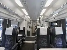 The Class 379 features a 2+2 seating arrangement for standard class, while 2+1 seating is installed in first class, providing 189 standard-class seats and 20 first-class seats across a typical consist.[4] The standard-class seats are mostly airline-style, with a few table seats. Each airline seat features a flip-down table, a coat hook, and a single electrical socket. There are two toilets per four-coach unit, one of them enlarged to accommodate baby-changing facilities and use by the disabled.[1] To assist airport-bound passengers, relatively large luggage racks are installed at several locations, in addition to the smaller overhead luggage racks.[5] A considerable number of bins are provided, to reduce littering and aid the cleanup process.[1]