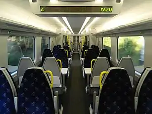 The Class 385 is a member of Hitachi's A-Train[1] family of aluminium trains and was the first order for the AT-200 commuter train model.[12][19] The trains are designed for a maximum speed of 100 mph (160 km/h). Sets are formed of two powered driving cars and one or two unpowered intermediate cars. The trains are fitted with a Hitachi-designed IGBT traction pack. Four-carriage trainsets feature four powered bogies per set and the three-carriage trainsets have three powered bogies per set. The passenger doors are plug type and are located at 1/3 and 2/3s along the car body. Seating is in a 2+2 configuration with a mixture of 4 seat table bays and airline seating with seat back tables. A toilet is fitted in each driving car. The trains are fully air conditioned. [1]