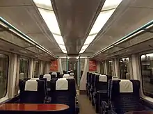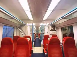 Additional modifications included re-gearing the traction motors to reduce the train's maximum speed from 100 mph (161 km/h) to 75 mph (121 km/h), both to reduce the likelihood of overheating when making frequent stops and starts, and because the higher speed was unnecessary on suburban services in any case.[10] New Train Management System (TMS) software was developed to be compatible across the entire Class 458/5 fleet, simplifying maintenance and improving reliability.[4] An Automatic Selective Door Opening (ASDO) system was installed for use at a small number of stations where it was impractical to lengthen platforms.[13] The vehicle interiors were refurbished and reconfigured as standard-class only, with 4-abreast seating and a wider aisle throughout.[13][4] The units were also repainted into SWT's blue livery, matching the Class 450 fleet.