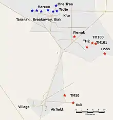 The task force, which began assembling in February 1956, included a section from the Royal Australian Survey Corps,[41] a troop of the 7th Field Squadron, detachments from the Royal Australian Navy (RAN) and Royal Australian Air Force (RAAF), and a civilian from the Department of Works and Housing. Their first task was establishing their own camp, with tents, showers and toilets.[42] A team from the South Australian Department of Mines sank a series of 90-to-350-metre (300 to 1,150 ft) bores to provide water. Like that at Emu Field, the bore water was brackish. Two Army skid-mounted 11-kilolitre-per-day (3,000 US gal/d) Cleaver-Brooks thermocompression distillation units provided water for drinking and cooking.[42][43] Work on the facilities themselves got off to a slow start, as KCG was running behind schedule, and unable to release promised earthmoving plant.[42] Some graders were used by day by KCG and by night by the task force. A call to Blomfield resulted in a grader being shipped from Adelaide to Watson two days later. The arrival of a 23-man detachment of the Radiation Detection Unit of the Corps of Royal Canadian Engineers was expedited so they arrived in June, and were able to pitch in with the construction effort.[44] In July, supplies coming from the UK were delayed by industrial action at the port of Adelaide.[42][45]