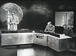 The London studio set of Apollo 11 consisted of "a long, angled desk, large models of the Moon and the Earth, and a large picture of a rocket against a dark, "cosmic"-type background. On the front of the desk was a digital clock which counted down the time to lift-off etc. Film animations and models of various parts of the spacecraft helped explain certain stages of the journey".[1]