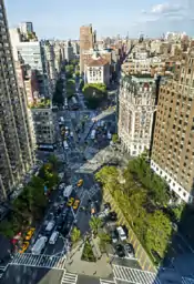 In spring 2017, as part of a capital reconstruction of Worth Square, Broadway between 24th and 25th Street was converted to a "shared street" where through vehicles are banned and delivery vehicles are restricted to 5 miles per hour (8.0 km/h). Delivery vehicles go northbound from Fifth Avenue to 25th Street for that one block, reversing the direction of traffic and preventing vehicles from going south on Broadway south of 25th Street. The capital project expands on a 2008 initiative where part of the intersection of Broadway and Fifth Avenue was repurposed into a public plaza, simplifying that intersection.[28] As part of the 2017 project, Worth Square was expanded, converting the adjoining block of Broadway into a "shared street".[29]