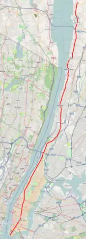 ![]() Daytime scene on Broadway ![]() Broadway through Manhattan, the Bronx and lower Westchester County is highlighted in red | |||