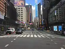 Since May 2009, the portions of Broadway through Duffy Square, Times Square, and Herald Square have been closed entirely to automobile traffic, except for cross traffic on the Streets and Avenues, as part of a traffic and pedestrianization experiment, with the pavement reserved exclusively for walkers, cyclists, and those lounging in temporary seating placed by the city. The city decided that the experiment was successful, and decided to make the change permanent in February 2010. Though the anticipated benefits to traffic flow were not as large as hoped, pedestrian injuries dropped dramatically and foot traffic increased in the designated areas; the project was popular with both residents and businesses.[26] The current portions converted into pedestrian plazas are between West 47th Street and West 42nd Street within Times and Duffy Squares, and between West 35th Street and West 33rd Street in the Herald Square area. Additionally, portions of Broadway in the Madison Square and Union Square have been dramatically narrowed, allowing ample pedestrian plazas to exist along the side of the road.
